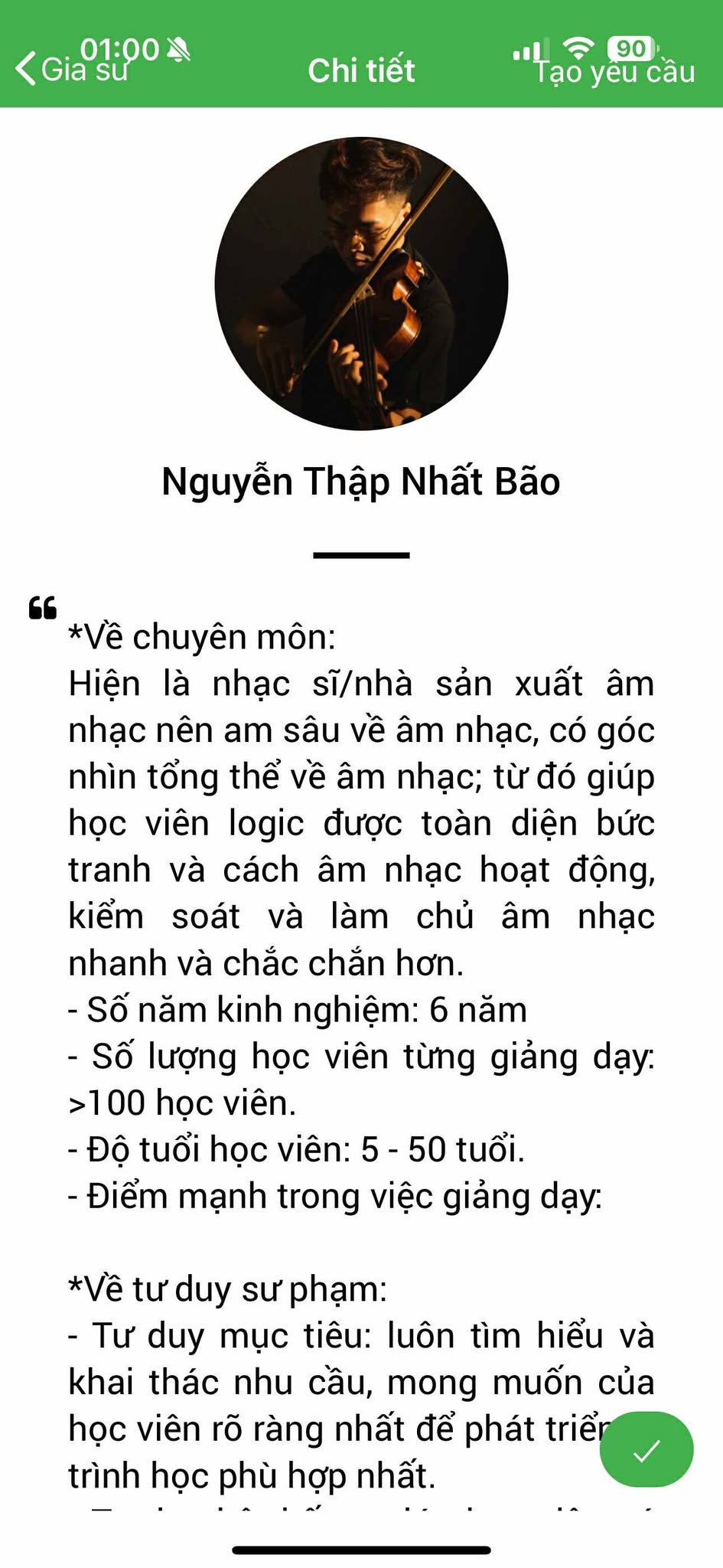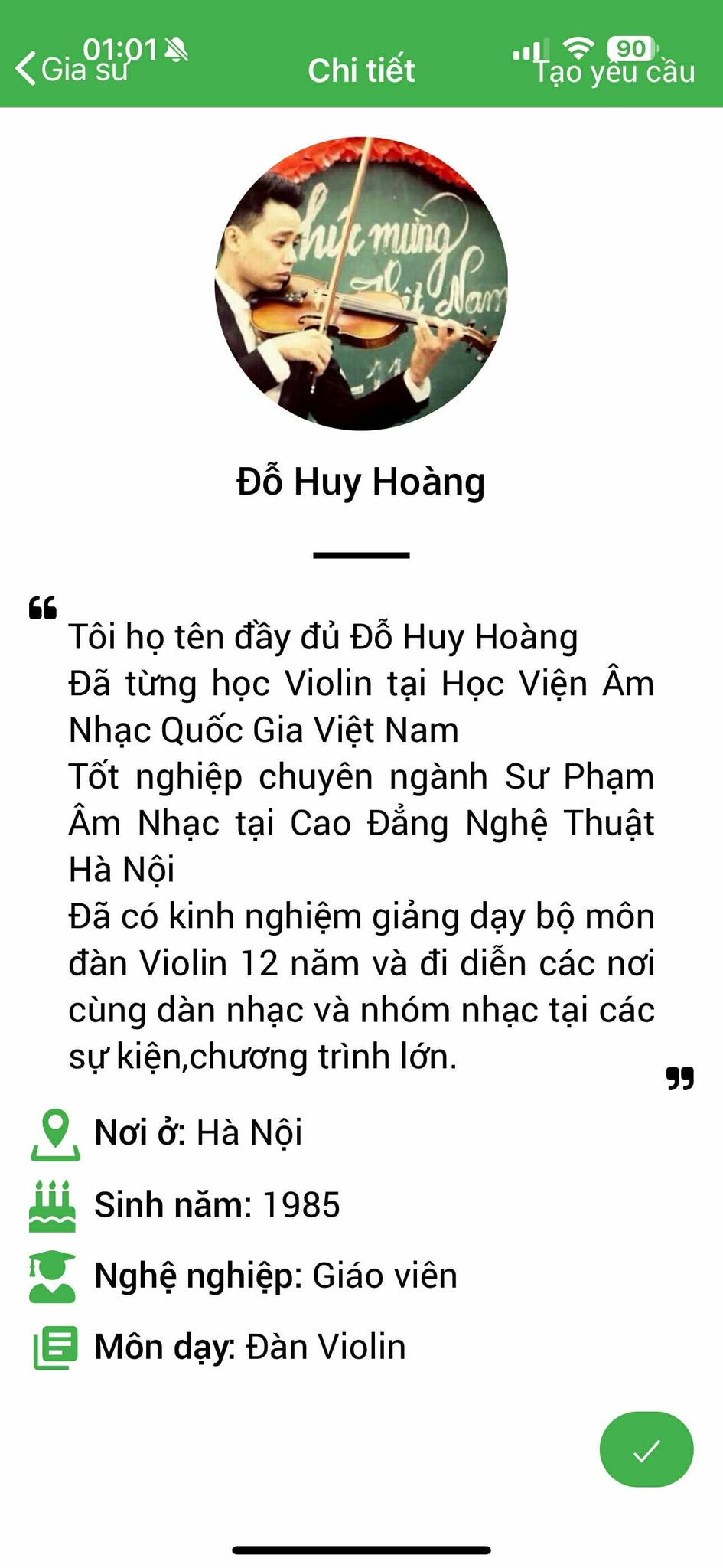 Đội ngũ gia sư Violin tại Daykemtainha.vn sẽ luôn đồng hành cùng học viên trong suốt quá trình học, giúp bạn không chỉ nắm vững kỹ thuật mà còn truyền cảm hứng và niềm đam mê âm nhạc thực thụ. Dù bạn là người mới bắt đầu hay đã có nền tảng, Daykemtainha.vn luôn có lộ trình học phù hợp, hiệu quả và đầy hứng khởi.